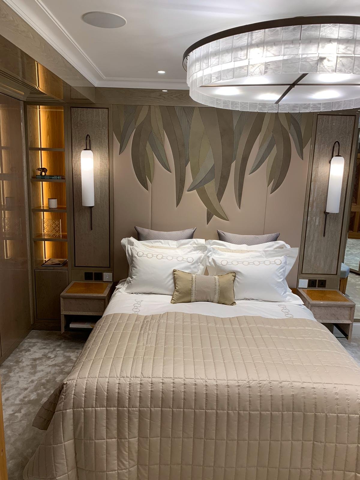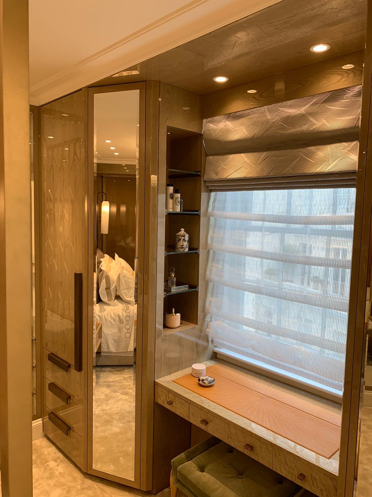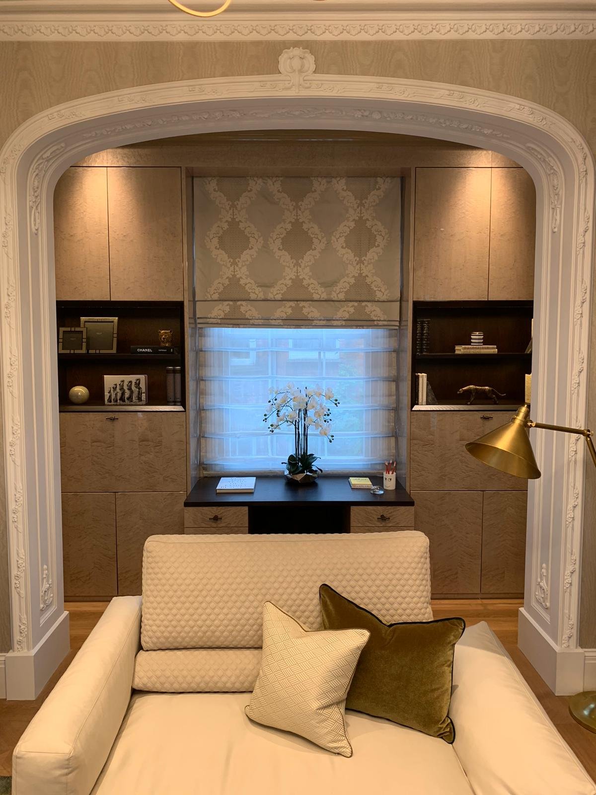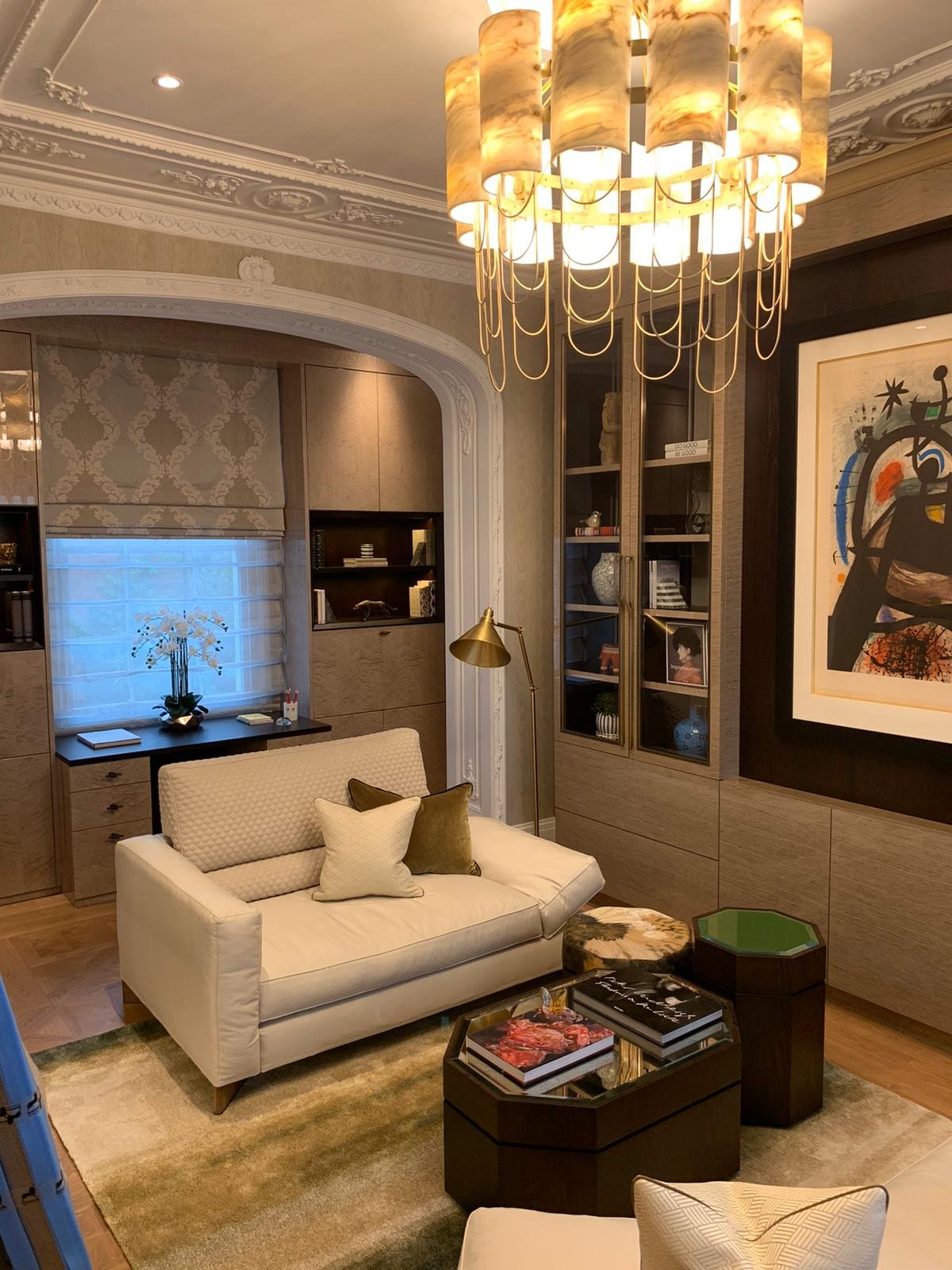 Drawing inspiration from the tailoring and craftsmanship, the design marries a rich colour palette with thoughtful detailing. Dark herringbone patterned floors reside alongside bespoke cabinetry in walnut burr, handcrafted crystal chandeliers and subtle pinstripe walls. Fixtures and Furniture supplied by TAFD from ITALY, worked very closely with the designer & client himself to meet all the requirements.